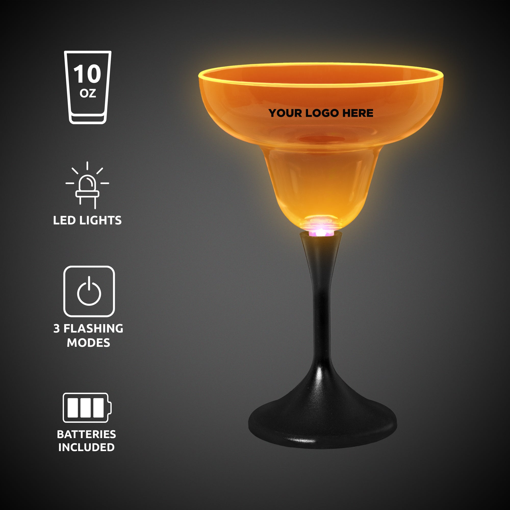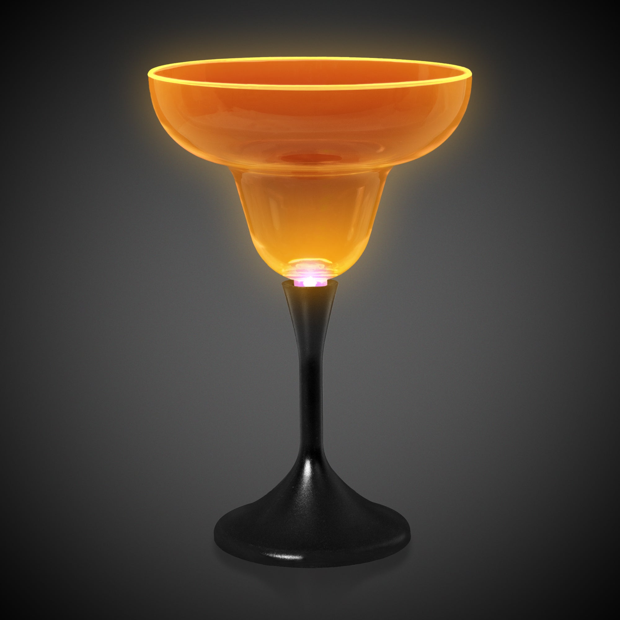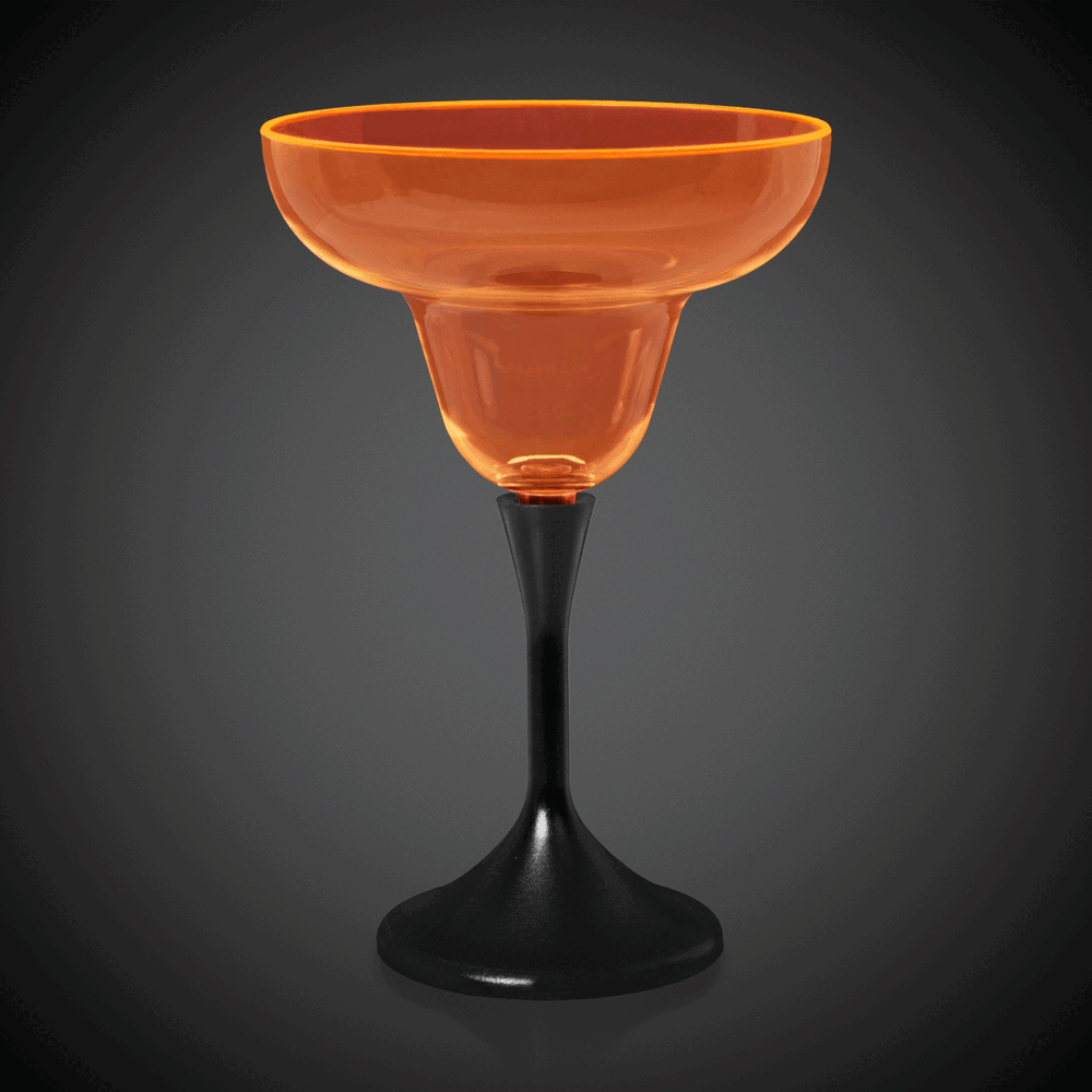 Serve up a sizzling signature cocktail at your next brightly colored event when you add our 10 oz Neon Orange LED Black Stem Margarita Glass to your party decoration. This black light-up stemware features a plastic neon orange top and a built-in blue LED to create an awesome look during the day, in the dark, and under a black light, too! Batteries are included & installed. Hand wash only.